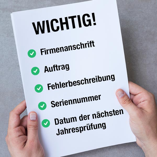 Arbeitsauftrag: Bitte geben Sie an, ob es sich um eine Jahresprüfung, Wartung oder eine Reparatur handelt. Dies ermöglicht es uns, den Service entsprechend durchzuführen.